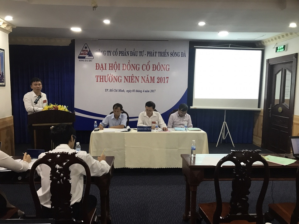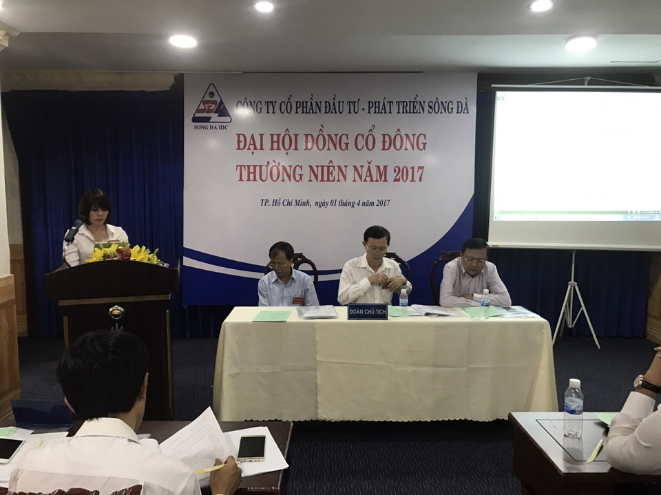 Vào lúc 8h00, ngày 01 tháng 04 năm 2017, tại Khách sạn New Pacific(lầu 1), số 9-11 Kỳ Đồng - Phường 9 - Quận 3 - Tp. Hồ Chí Minh; Đại hội đồng cổ đông thường niên năm 2017 Công ty cổ phần Đầu tư - Phát triển Sông Đà đã được tổ chức với sự tham dự của 19 cổ đông trên tổng số 927 cổ đông được mời tham dự Đại hội đại diện sở hữu và sở hữu : 12.923.018 cổ phần, đạt tỉ lệ 80,77% tổng số cổ phần có quyền biểu quyết.